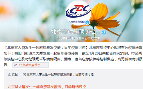 据北京疾病预防控制中心官方微博消息,2015年1月22日,北京市疾控中心接到东城区疾控中心报告,该区朝阳门街道的某大厦发生了一起麻疹暴发疫情。截至2015年1月26日共报告麻疹病例23例。