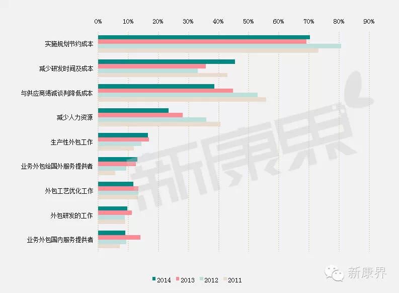 然而在一些缺乏共性的外包上,存在一种普遍性回落。这些业务包括下游生产操作、下游工艺优化、试验设计。当涉及设备问题及纯化上的瓶颈时,某些下游业务也可能有所下降。尽管有些类型的外包业务下降这一事实确实是存在的,但就目前此类业务的外包水平而言,仍然高于2010年度的水平。 数据显示最常规的外包服务正在成为主流的外包生产服务。BioPlan预测这一趋势将继续,同时调研同样显示,接下来的一年将外包业务延伸到更深层次的趋势。 趋势二:外包不再为了节约成本 过去的几年里,外包作为一种减少成本及更有效的分配内部资源的途径被生物制药公司采用。BioPlan最近的调研显示节约成本不再是业务外包的首要目的。在问及过去的12个月里公司所采取的减少成本的措施时,仅有9%受访公司出于节约成本的目的,把业务外包给国内服务供应商,比去年减少14%。把制造业务外包给国外服务供应商的公司, 2011年约6%,自2011年来基本持平在13%(图1)。 同时受访者为了节约成本,把生产、工艺优化、研发工作外包的比例保持不变、或者可以说比去年有轻微的下降。BioPlan调研指出,在相关的研发领域当开发商考虑与生产合作伙伴签订契约时,成本效应不再像去年那样,成为最大的优势。仅22%的公司宣称CMO服务的成本效应对他们来说非常重要,而去年的调研数据是42%,今年约为去年的一半。 进一步说,相对于公司其它预算,外包部分的预算正在快速增长。因外包是一个长期的战略性决策,除非可能采购设备,公司不会轻易改变外包的预算。而今年,受访者称已经把公司的生物制药生产外包预算增加近4%,高于前5年中的任何一年。外包服务正在担任越来越重要的角色,正从简单的开源节流向基于质量与价值的合作关系转变。 趋势三:从管理的层面评估外包合作关系 承包商应该显示自身的技术优势(尤其承包商竞标之前被认为核心而不敢外包的高价值业务时)。BioPlan的调研数据显示,基于管理及“人”的因素对承包商的价值进行评价的外包客户正在持续增加。 调研时,当被问及业务外包给CMO时应当着重考虑的问题是什么,答案如下: 建立一种良好的合作关系(98.2%的决策者认为“十分重要”或“重要”)、紧跟项目进度(94.5%)。 认为建立一种良好的合作关系十分重要的受访决策者占70.9%,这一比例高于认为首要考虑以下因素的受访决策者:供应商的质量标准、知识产权保护措施、交叉污染问题的有效处理等。 总之,当技术资质处于重要地位时,客户认为靠他们自己是不够的。而有效的合作伙伴关系是建立在牢固的人事关系上的。 图1:节约成本所选择的方式比较——2011-2014
