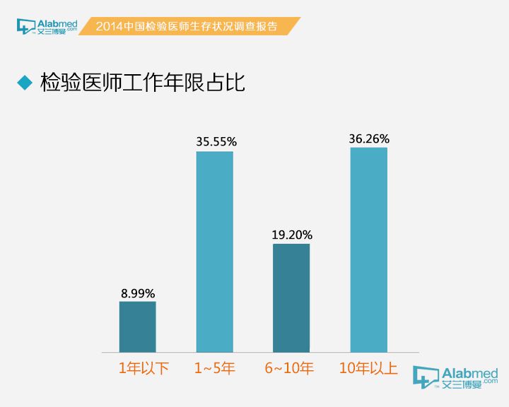福利待遇情况年假休息时间 检验医生的年假可以休息多长时间呢?统计数据显示,41.27%的检验医生年假在3~6天,26.97%的检验医生在2014年完全没有休过年休假。而37.5%的45岁以上医生的年假≥7天,年龄段在18~25岁,26~35岁,36~45岁的医生年假在7天以上的分别为20.91%,17.38%和28.50%。45岁以上的检验医生7天以上年休假百分比为26~35岁检验医生7天以上年休假百分比的2.16倍;有趣的现象是,完全没有年休假的45岁以上的检验医生百分比为26~35岁检验医生百分比的1.18倍。上述数据与按照工作年限分类的结果类似。