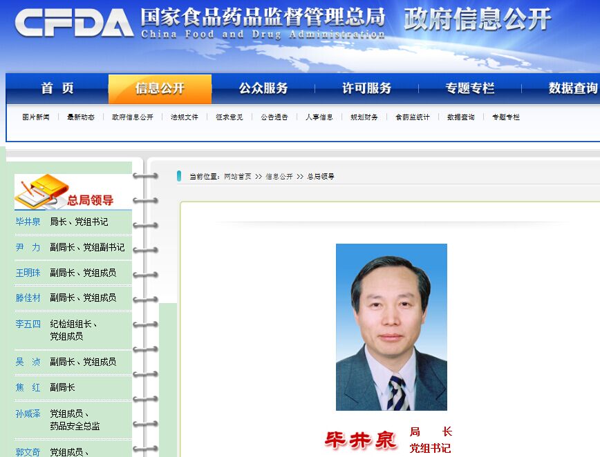 2月6日,CFDA官网“总局领导”一栏信息发生变动:毕井泉担任局长、党组书记的信息及其简历首次出现在CFDA官网,而正式上任的时间为2015年1月。需要关注,毕井泉的工作职责主要分为两部分:第一、负责总局全面工作;第二、分管人事司。