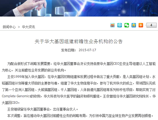 根据华大基因官方网站华大资讯发布的最新消息:关于华大基因组建前瞻性业务机构的公告,经华大基因董事会的决议,同意王俊(AEBB-WANGJUN)递交的辞去华大基因集团执行总裁、华大研究院院长及华大股份执行总裁职务的申请。
