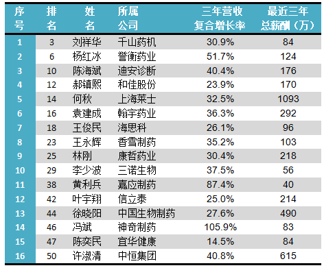 此次榜单中医药领域共有16人上榜,其中有3人排在总榜的前十位;分别是刘祥华(千山药机)、杨红冰(誉衡药业)和陈海斌(迪安诊断)。值得注意的是,千山药机虽被福布斯归为“工业机械”行业,但是笔者认为该公司近两年的布局已明确的向医药行业深入。