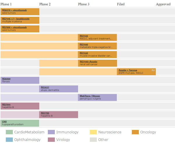罗氏在肿瘤免疫疗法领域的pipeline 除此之外,罗氏还在加速一些治疗血癌的药物研究,例如venetoclax(ABT-199)在治疗慢性淋巴细胞白血病的二期临床试验结果较好。Venetoclax也已经被认定为突破性疗法药物,这是罗氏和艾伯维公司共同开发的。罗氏在2015年的第二季度还获得了系统性硬化病试验药物Actemra/RoActemra的突破性疗法地位。 除此之外,FDA还将继续加速对新型抗癌药的审批工作,罗氏已经占据了肿瘤市场的60%的市场,成为全球抗癌药的领衔者。 彭博社智库分析专家认为,到2020年,罗氏的抗癌药将卖到300亿美元。在2015年,罗氏预计整体营收将会下降到个位数,但是核心业务盈利增长速度将超过收入。