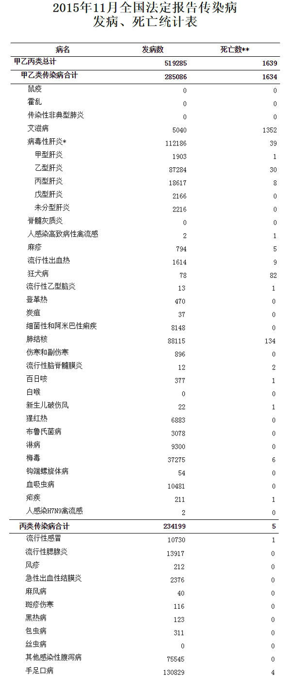 2015年11月(2015年11月1日0时至11月30日24时),全国(不含港澳台,下同)共报告法定传染病519285例,死亡1639人。其中,甲类传染病中鼠疫和霍乱均无发病、死亡报告。乙类传染病中传染性非典型肺炎、脊髓灰质炎和白喉无发病、死亡报告,其余23种传染病共报告发病285086例,死亡1634人。报告发病数居前5位的病种依次为病毒性肝炎、肺结核、梅毒、血吸虫病和淋病,占乙类传染病报告病例总数的90%。 同期,全国共报告丙类传染病发病234199例,死亡5人。其中丝虫病无发病、死亡报告,报告发病数居前3位的病种依次为手足口病、其他感染性腹泻病和流行性腮腺炎,占丙类传染病报告病例总数的94%。