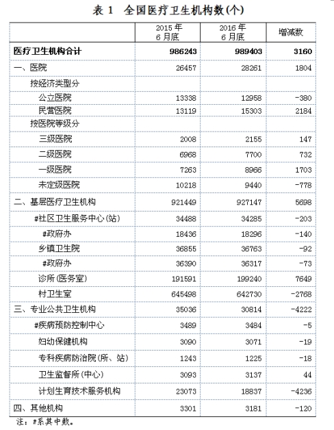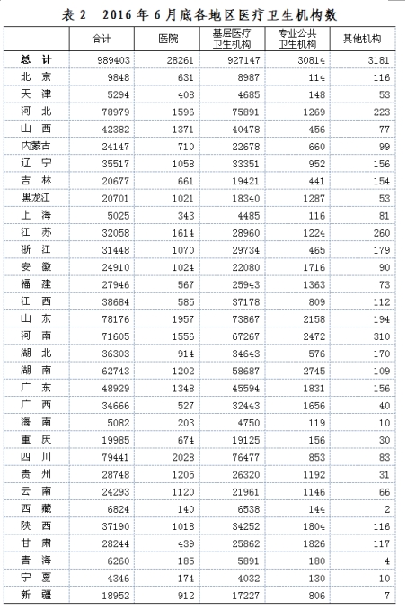 截至2016年6月底,全国医疗卫生机构数达98.9万个,其中:医院2.8万个,基层医疗卫生机构92.7万个,专业公共卫生机构3.1万个,其他机构0.3万个。与2015年6月底比较,全国医疗卫生机构增加3160个,其中:医院增加1804个,基层医疗卫生机构增加5698个,专业公共卫生机构减少4222个。 医院中:公立医院12958个,民营医院15303个。与2015年6月底比较,公立医院减少380个,民营医院增加2184个。 基层医疗卫生机构中:社区卫生服务中心(站)3.4 万个,乡镇卫生院3.7 万个,村卫生室64.3万个,诊所(医务室)19.9万个。与2015年6月底比较,诊所增加,社区卫生服务中心(站)、乡镇卫生院和村卫生室减少(见表1)。 专业公共卫生机构中:疾病预防控制中心3484个,卫生监督所(中心)3173个。与2015年6月底比较,疾病预防控制中心减少5个,卫生监督所(中心)增加44个。 各地区医疗卫生机构数见表2。 ![]() |