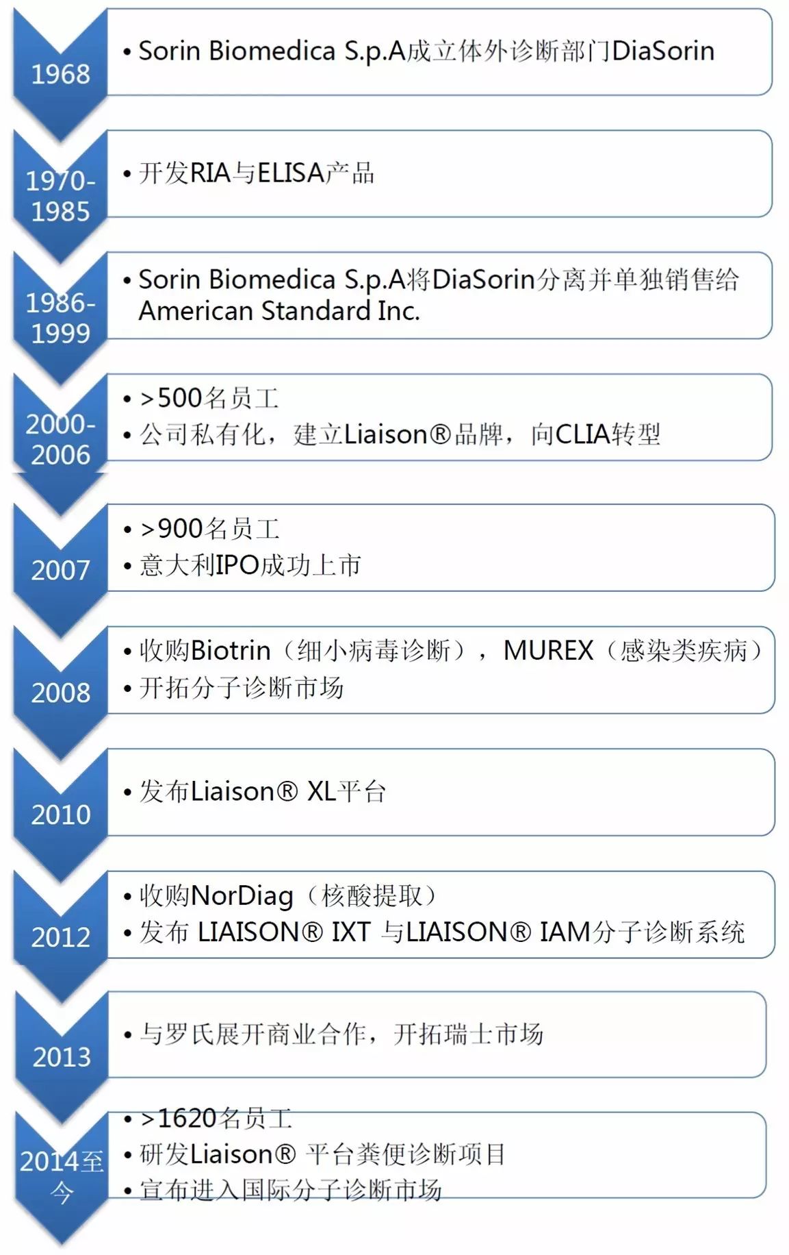 今天推出《11大IVD巨头企业发展史汇编》系列第十篇——— DiaSorin S.p.A. 1 公司概况 简介 意大利Diasorin S.p.A.创建于1968年,是全球体外诊断市场的领导者。曾是意大利Sorin Biomedica SpA的体外诊断部,2000年部门高层认购全部股票后独立出来成立DiaSorin S.p.A.,为意大利独立上市公司,作为FTSE Italia Mid Cap Index(盘中指数)的一员。具有近50年生物医学领域的研发经验,其放射免疫和酶免疫在欧洲及全球享有极高的知名度,一直致力于医院及私人实验室的免疫诊断,及分子诊断测试。 截至至2015年底,DiaSorin员工超过1600人,超过80个代理商。公司目标:Improving the health and quality of people’s lives。 部门分布 Diasorin于全球共6家工厂,5间研究实验室,27间分公司,销售网络遍布全球100+国家。 研发能力 发展历程 2 收并购介绍 3 营收情况 2015年年销售额: |