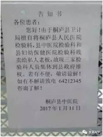 “检验科要独立”仅仅是大家对政策的误读吗?这事就真的发生了! 近日,一张“浙江桐庐县卫计局将县医院、县中医院、妇幼保健院检验科卖给企业,三家医院检验科职工要找地方政府维权”的爆料图片在医疗圈引起轩然大波。桐庐检验科事件到底是什么情况呢?