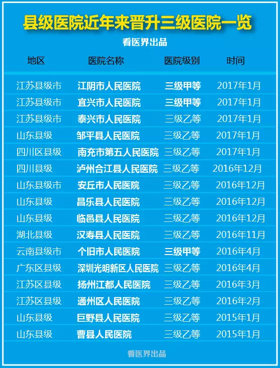 一大批县级医院晋为三级 分级诊疗需要三甲医院帮扶县医院?县医院已经在批量进入三级医院俱乐部了! 近日,据《看医界》获悉,又有一大批县级医院迈入三级医院俱乐部,甚至一些县级医院还成为了三甲医院。