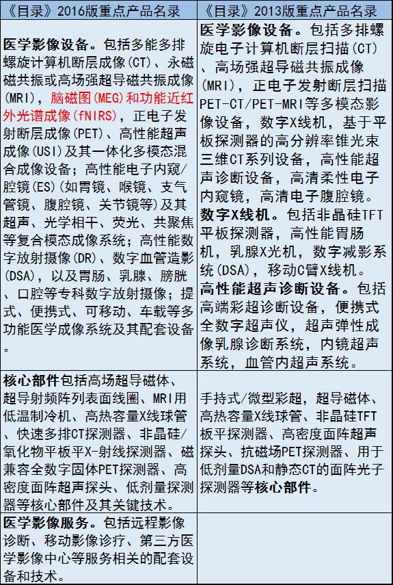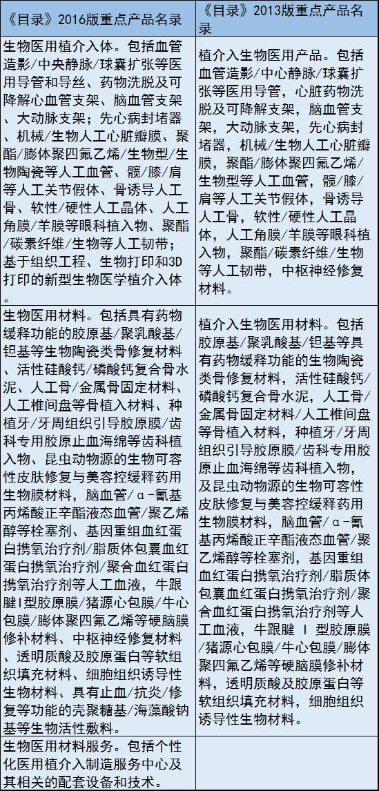 为贯彻落实《“十三五”国家战略性新兴产业发展规划》,引导全社会资源投向,发改委会同科技部、工信部、财政部等根据战略性新兴产业发展新变化,对《目录》) 2013版作了修订完善,形成了《目录》2016版。 《目录》2016版涉及5大领域8个产业,又进一步细化到40个重点方向下 174个子方向,近4000项细分产品和服务。其中包括生物医药产业和生物医学工程产业,前者也即制药产业,后者也即医疗器械产业。 赛柏蓝器械注意到,与原有的《目录》2013版相比,《目录》2016版划定的医疗器械产业重点方向仍是4个,包括医学影像设备、先进治疗设备、医用检查检验仪器、植介入生物医用材料。但是,每个重点方向下的重点产品名单有了不少变化,而且将与产品配套的重点服务也纳入进去了。 我们针对每个重点方向分别对比整理如下: 1、医学影像设备及服务 ![]() 2、先进治疗设备及服务 ![]() ![]() ![]() 3、医用检查检验仪器及服务 ![]() ![]() 4、植介入生物医用材料及服务 |
