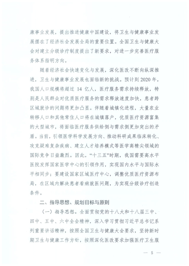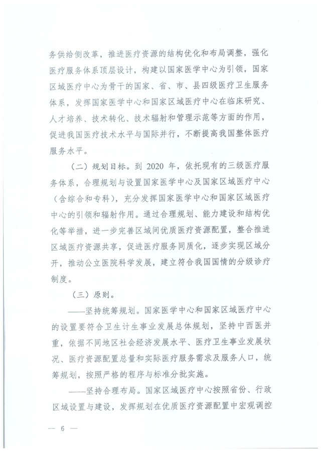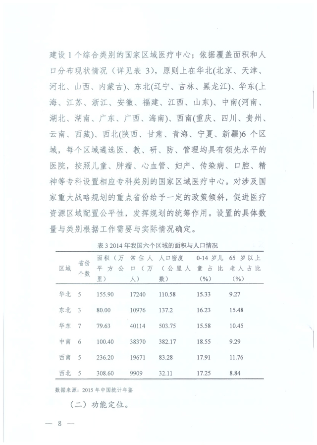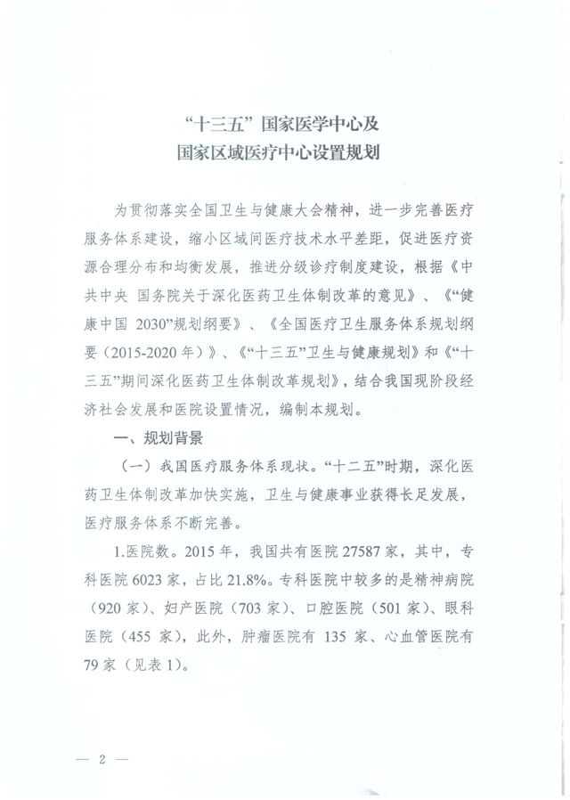 据国家卫生计生委医政管理局官网消息,2017年1月22日,国家卫生计生委印发《“十三五”国家医学中心及国家区域医疗中心设置规划》(国卫医发〔2017〕3号,以下简称《规划》),启动国家医学中心和国家区域医疗中心规划设置工作。此前,2016年7月,国家卫生计生委办公厅曾印发《关于国家儿童医学中心及国家儿童区域医疗中心设置规划的通知》(以下简称《国家儿童医学中心规划》),明确国家儿童医学中心由国家卫生计生委依照国家儿童医学中心设置标准,统筹考虑全国儿科医疗资源情况进行设置,同时要求各省级卫生计生行政部门于10月1日前将国家儿童区域医疗中心建设方案和主体医院2010-2015年相关数据(对照设置标准)报送国家卫计委。因此,此次发布的的《规划》可看做《国家儿童医学中心规划》的升级版。 为什么要出台《规划》 根据国家卫生计生委的官方解读,随着医改不断向纵深推进,我国医疗服务体系不断完善,医疗服务水平实现较快提升。但是,伴随老龄化、城镇化等社会经济转型过程,居民基本健康需求增长迅速,呈现出多样化特点,供给侧结构性问题仍旧突出,医疗机构布局和能力与人民群众的需求之间还有差距。一是医疗资源总量不足,优质医疗资源短缺。二是医疗资源分布不均衡,且集中在经济较发达的省份和城市。三是医疗服务体系不完善,科学有序的就医格局尚未形成,出现患者向大医院集中、跨区域就诊的现象。四是国内医院在科研、学术、成果转化等医学高精尖领域与国际顶尖水平还有距离。 按照全国卫生与健康大会要求,国家卫生计生委着眼于加强医疗卫生服务供给侧改革,贯彻落实新时期卫生与健康工作方针,主动调整医疗资源的结构与布局,启动国家医学中心和国家区域医疗中心规划设置工作。强化医疗服务体系顶层设计,构建以国家医学中心为引领,国家区域医疗中心为骨干的国家、省、市、县四级医疗卫生服务体系,发挥国家医学中心和国家区域医疗中心在临床研究、人才培养、技术转化、技术辐射和管理示范等方面的作用,促进我国医疗技术水平与国际并行,不断提高我国整体医疗服务水平。 国家医学中心和国家区域医疗中心规划设置的基本原则和数量 国家医学中心和国家区域医疗中心规划设置应当坚持以下原则: 一是坚持统筹规划。要符合卫生计生事业发展总体规划,坚持中西医并重,依据不同地区社会经济发展水平、医疗卫生事业发展状况、医疗资源配置总量和实际医疗服务需求及服务人口,统筹规划,按照严格的程序与标准分批实施。 二是坚持合理布局。国家区域医疗中心按照省份、行政区域设置与建设,发挥规划在优质医疗资源配置中宏观调控作用,带动优质医疗资源整合和纵向流动,解决区域间医疗资源不平衡的结构性矛盾。 三是坚持整体效益。充分发挥国家医学中心和国家区域医疗中心技术优势和核心作用,加强医疗卫生服务资源的整合利用,中西医协作,提升整体服务能力和技术水平,提高医疗卫生服务体系整体效益。 四是坚持择优设置。遴选管理水平高、基础设施好、医疗技术先进、服务能力强的医院,根据不同类别国家医学中心和国家区域医疗中心设置标准,进行规划建设与设置。 五是坚持融入战略。将国家医学中心和国家区域医疗中心设置规划融入“一带一路”、长江经济带、京津冀协同发展、振兴东北老工业基地、西部大开发、原中央苏区振兴发展等国家战略,与相关部门建设项目、资金投入相结合,形成工作合力。 在数量方面,国家医学中心将在全国范围按综合、肿瘤、心血管、妇产、儿童、传染病、口腔、精神专科类别设置。同时,根据重大疾病防治需求,设置呼吸、脑血管、老年医学专业国家医学中心。设置的具体数量与类别根据工作需要与实际情况确定。 国家区域医疗中心按照每个省(自治区、直辖市)遴选在医、教、研、防、管理均具有领先水平的综合医院,设置建设1个综合类别的国家区域医疗中心。依据覆盖面积和人口分布现状情况,原则上在华北、东北、华东、中南、西南、西北6个区域,每个区域遴选医、教、研、防、管理均具有领先水平的医院,按照肿瘤、心血管、妇产、儿童、传染病、口腔、精神等专科设置相关专科类别的国家区域医疗中心。对涉及国家重大战略规划的重点省份给予一定的政策倾斜(如上文提到的“一带一路”、长江经济带、京津冀协同发展、振兴东北老工业基地、西部大开发、原中央苏区振兴发展等),促进医疗资源区域配置公平性,发挥规划的统筹作用。设置的具体数量与类别根据工作需要与实际情况确定。 国家医学中心和国家区域医疗中心的功能定位是什么? 国家医学中心主要定位于,在疑难危重症诊断与治疗、高层次医学人才培养、高水平基础医学研究与临床研究成果转化、解决重大公共卫生问题、医院管理等方面代表全国顶尖水平、发挥牵头作用,在国际上有竞争力。引领全国医学技术发展方向,为国家政策制定提供支持,会同国家区域医疗中心带动全国医疗、预防和保健服务水平提升。 国家区域医疗中心主要定位于,在疑难危重症诊断与治疗医学人才培养、临床研究、疾病防控、医院管理等方面代表区域顶尖水平。协同国家医学中心带动区域医疗、预防和保健服务水平提升,努力实现区域间医疗服务同质化。 国家医