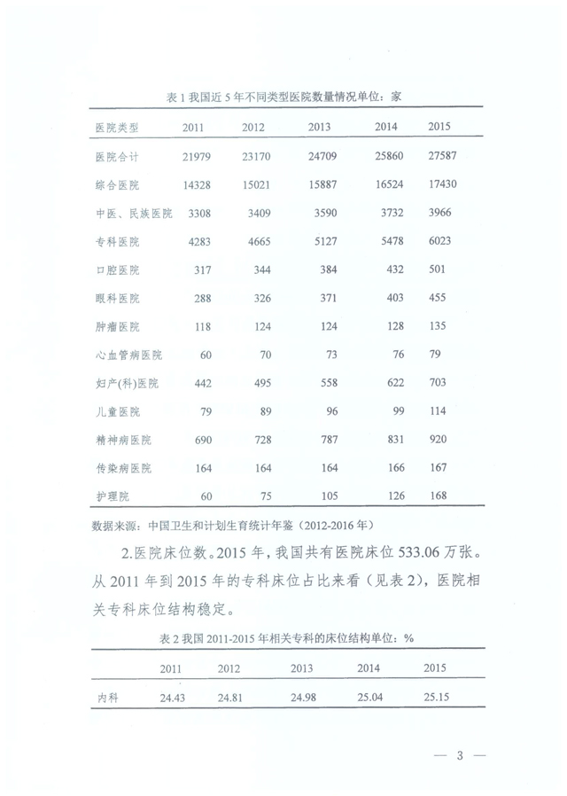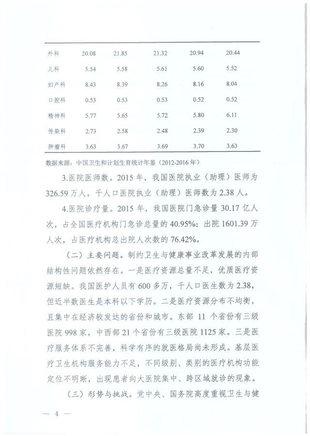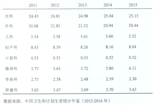 截至2015年,我国医院执业(助理)医师为326.59万人,千人口医院执业(助理)医师数为2.38人。 截至2015年,我国医院门急诊量30.17亿人次,占全国医疗机构门诊急诊总量的40.95%;出院1601.39万人次,占医疗机构总出院人次数的76.42%