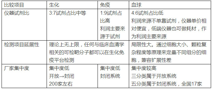 POCT市场特点: 1) 市场集中度低:POCT是IVD细分市场中较容易切入的市场之一,普遍规模较小。该领域的佼佼者是深圳国赛(特种蛋白)和南京基蛋(心肌标志物) 2)行业无统一标准 3) 国内检验科对POCT态度不一: ⊙二甲以上医疗机构由于资金雄厚,检验科设备多为进口品牌,常规检测为主,不需要POCT。临床科室使用POCT,会减少检验科的收入,因此限制POCT的广泛使用。 ⊙对临床科室来说定量/半定量的POCT产品临床意义重大,而且用量很大。如能采取更合理的利益分成方式,比如由检验科集中管理仪器,临床科室外借,或将推动POCT的发展。 ⊙二甲以下基层医院,检验科样本量少,技术水平相对较低,大型设备的实用性差,因此检验科通常使用POCT产品替代传统检验方法来诊断。由于检测量小,产品分散,这块市场通常不受国际厂家和国内一线品牌公司重视。 这5个细分领域中,技术平台、销售渠道、市场格局、经营状况等差异较大。