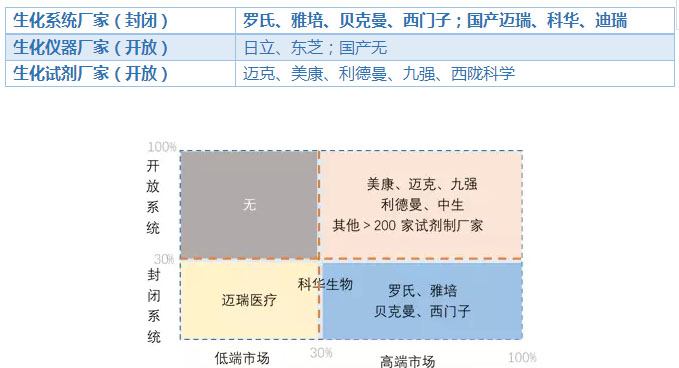 全球生化诊断市场半壁江山被罗氏和贝克曼·库尔特(丹纳赫)所占据,前四家占据85%的份额。