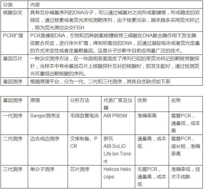 目前应用最广的是二代测序,全球被Illumina和Life tech垄断,市面上基本无国产仪器。三代测序由于测序准确度的问题还未广泛推广应用,多在研究阶段,但由于其无需PCR,避免了在分子扩增过程中由于扩增偏好性产生的错误,且成本低,通量高,真正做到单分子测序,如能解决准确性和自动化的问题,在临床上具有广阔应用前景。