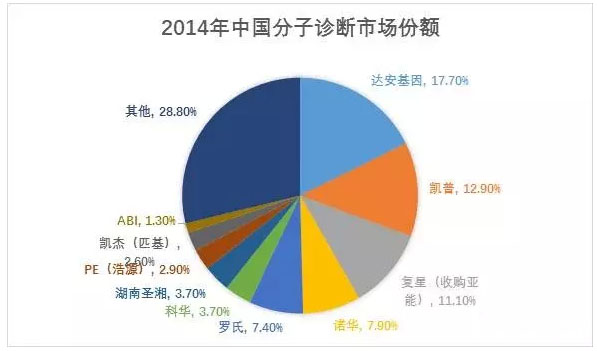 分子诊断广泛应用于传染病、血筛等领域,随着人们生活水平的提高,对分子诊断的认知和需求会越来越多,医疗卫生产业发展不再局限于诊疗,而是延伸到预防性医学。随着人类基因图谱的破译,分子诊断在个体化精准治疗甚至大消费方面也有广阔前景。 分子诊断未来充满各种可能性,但要警惕精准诊疗的泡沫 分子诊断作为一项前沿技术,对医学诊断有很大贡献。目前在我国分子诊断主要应用是传染病的检测,比如HPV、HBV、HCV、HIV等。在产前筛查应用也相对成熟,如华大基因,贝瑞和康等,胎儿外周血游离DNA检测已经逐渐替代羊水穿刺技术。 5.POCT 属于检验的分类,非产品或项目 市场份额分散,行业增速较快,技术日新月异 POCT市场尚未成熟,各厂家市场份额较小,,整体处于量多质次的阶段 由于检验平台方法差异较大,统一检测项目有多种方法,参考范围难以界定,测量结果准确度难以保证,行业也没有相关质量控制标准,将会较长时间保持混沌分散状态。参考POCT国际巨头Alere的发展历程,行业内并购整合是最高效的发展模式