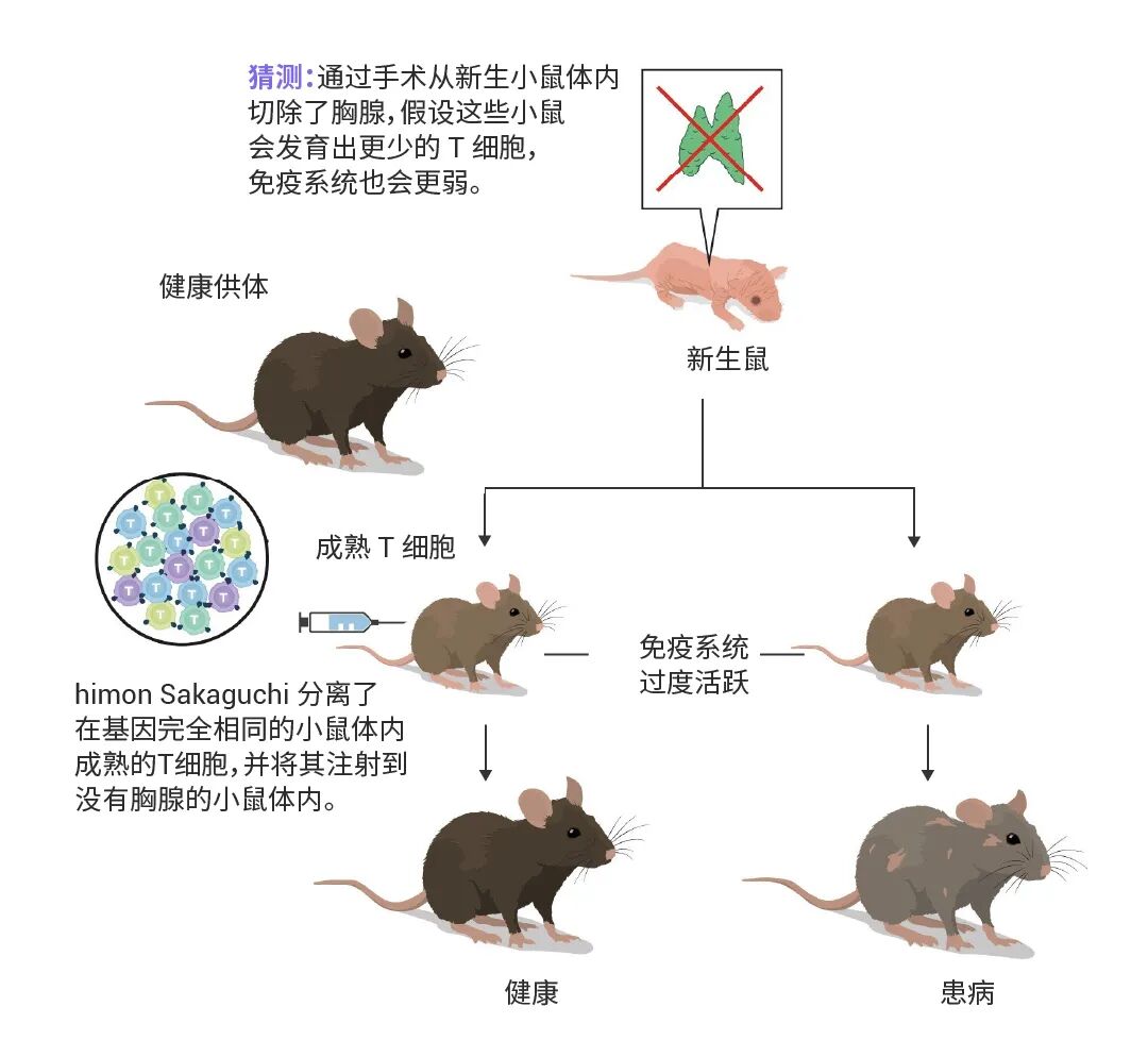 当 Sakaguchi 给摘除胸腺后患上自身免疫性疾病的小鼠注射来自其他小鼠的成熟 T 细胞时,这些小鼠便能免受自身免疫性疾病的侵害。