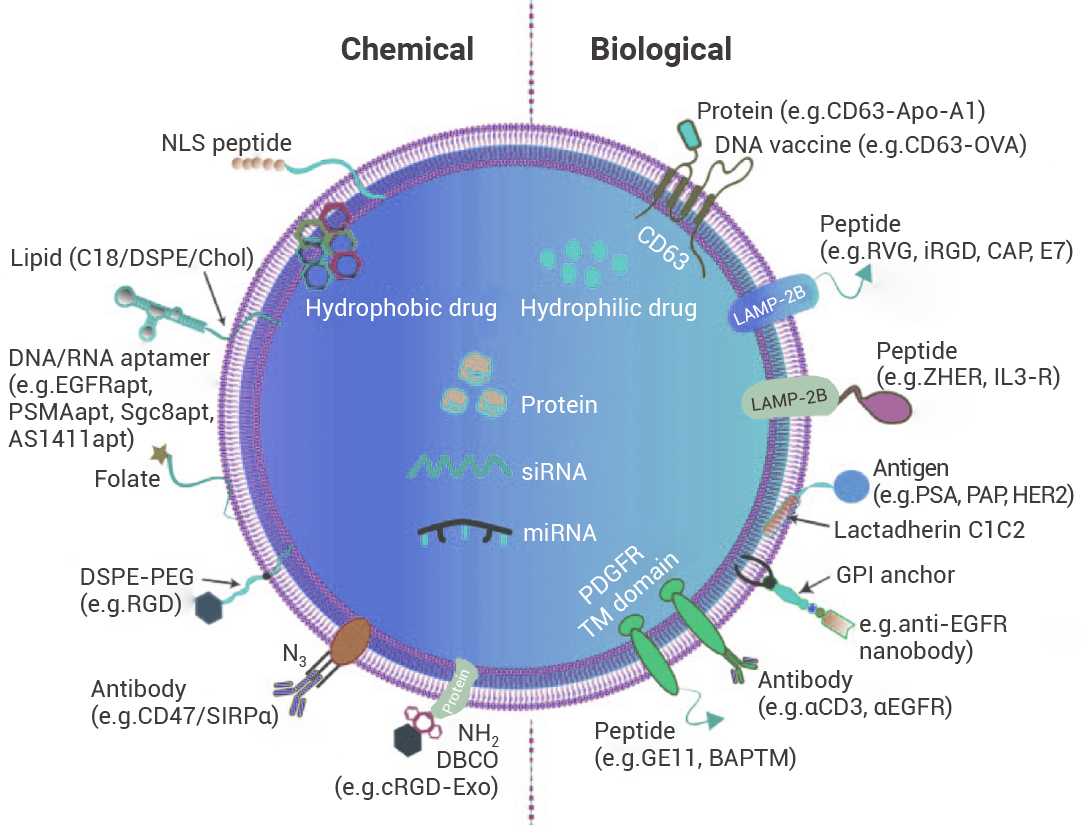 图 4. 借助遗传/生物操作或化学修饰对外泌体表面实施工程化改造[5]。 遗传工程和靶向基序展示 外泌体膜天然含有蛋白质,如四跨蛋白、整合素和凝集素。这些蛋白质可以通过与靶细胞受体的相互作用来影响外泌体生物分布。通过基因调节亲本细胞以过表达或敲低特定蛋白质,可以显着增强工程外泌体的靶向能力。 细胞结合基序可以通过蛋白工程方法展示在外泌体表面,这些方法通常包括使用病毒靶向基序、细胞穿透肽和蛋白质转染域。值得注意的是,这些元素中的每一种在增强外泌体靶向和穿透细胞的能力方面都发挥着独特的作用,这使得它们成为靶向药物递送和疾病治疗领域中有价值的工具。